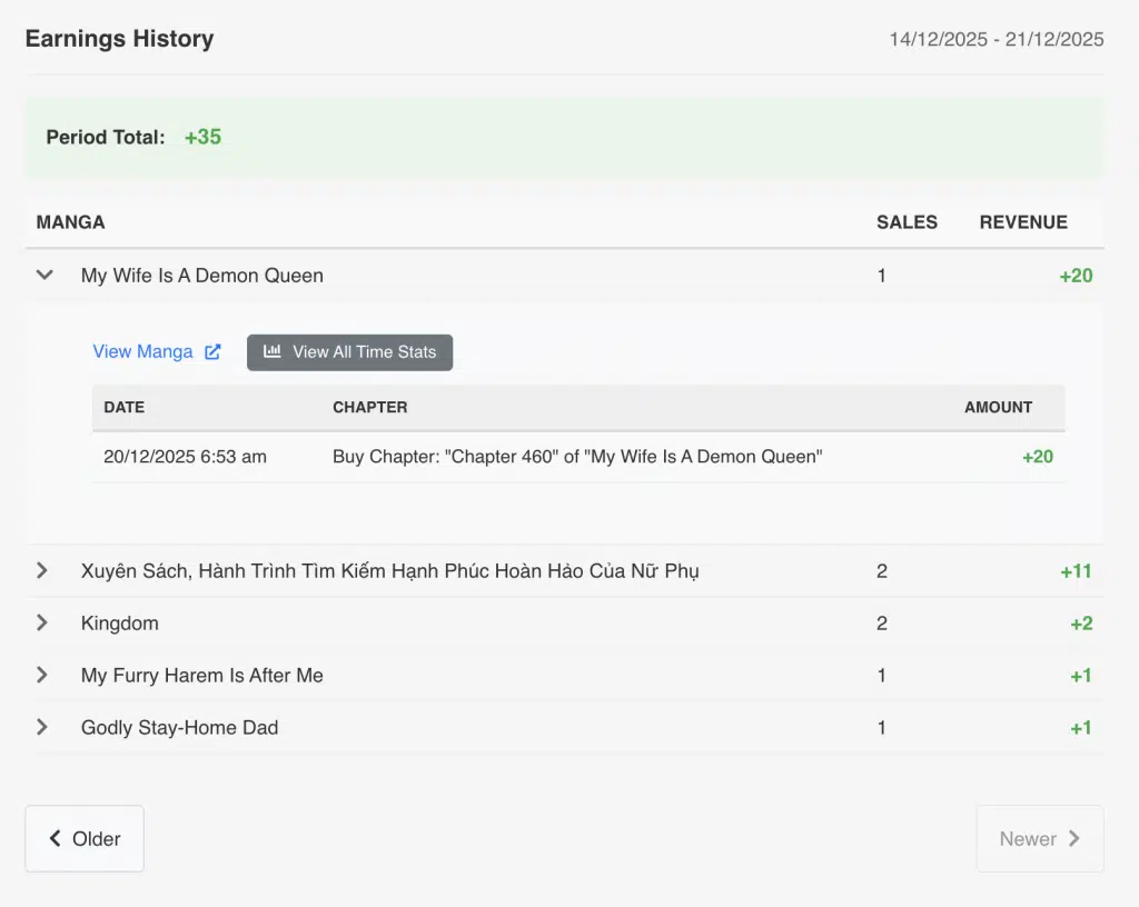 Each time a reader unlocks a premium chapter, coins are recorded and attributed correctly. Authors can now: